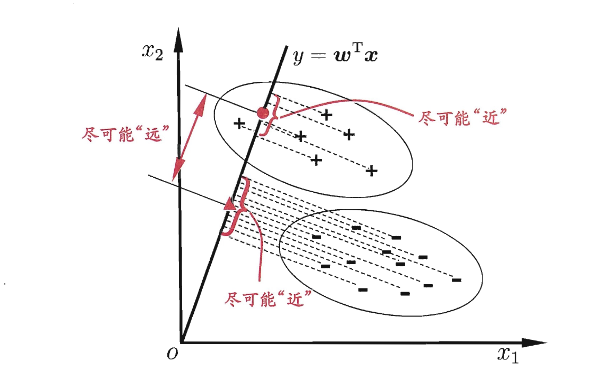 - 给定训练样例集,设法将样例投影到一条直线上,使得同类样例的投影点尽可能接近、异类样例的投影点尽可能原理;