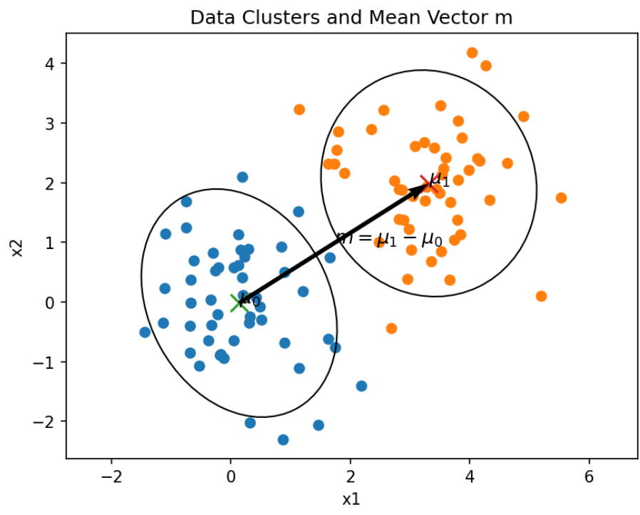 # Plot data clusters (covariance ellipses) and mean vector m = mu1 - mu0