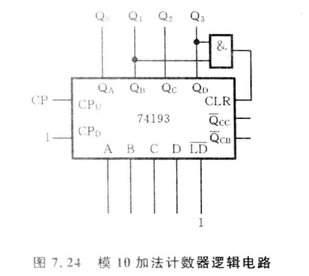 例 用4位二进制同步可逆计数器74193构成模10加法计数器