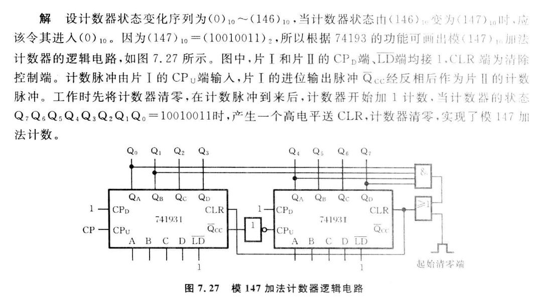 例 用两片4位二进制同步可逆计数器74193构成模(147)10的加法计数器